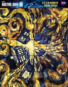 This is a 8.5 x 10 inch puzzle of the exploding Tardis but not just any jigsaw puzzle this one is magnetic and that means you can have it hang on your fridge.
